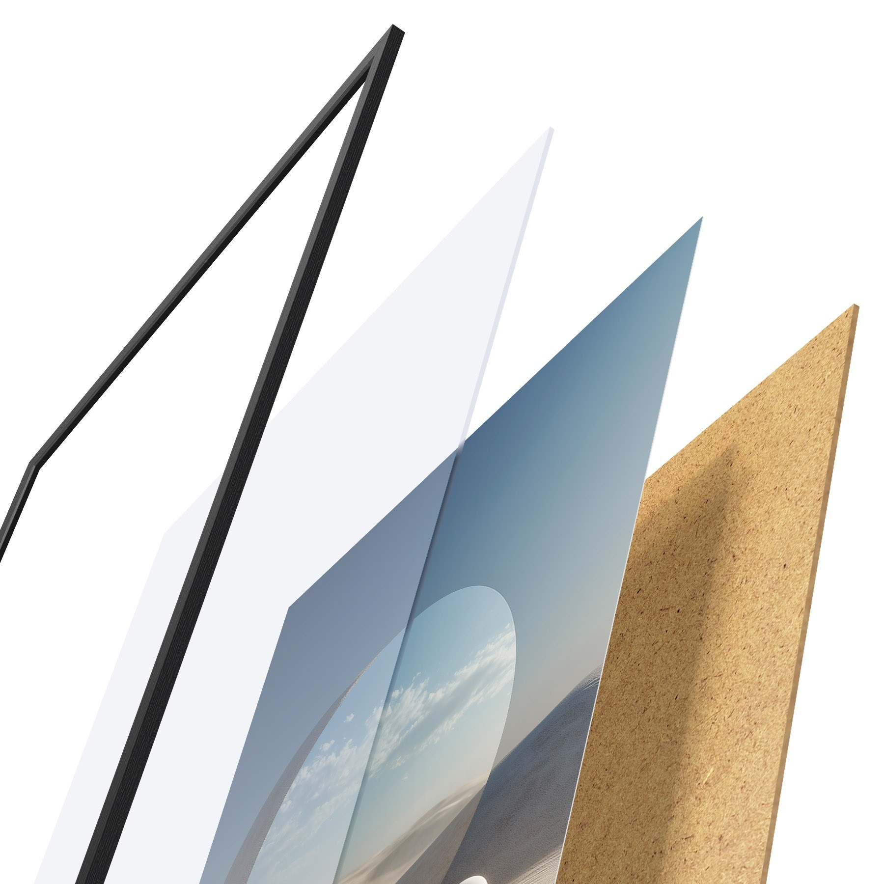 Plakatą sudaro rėmas, pleksiklas, atspausdintas vaizdas ir medžio drožlių plokštės pagrindas. Plakatą galima iš karto pakabinti ant sienos dėl kitoje pusėje esančių laikiklių.
