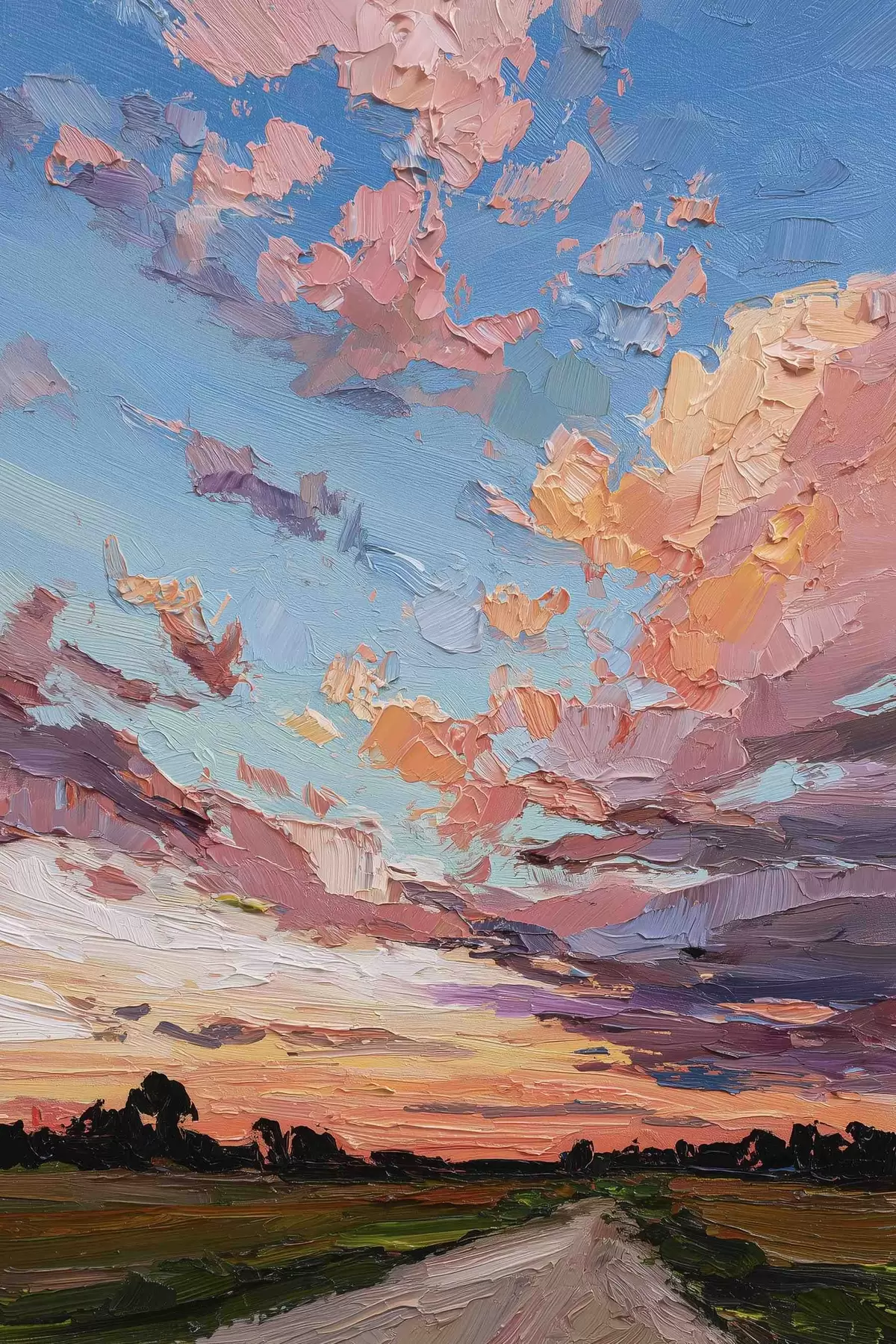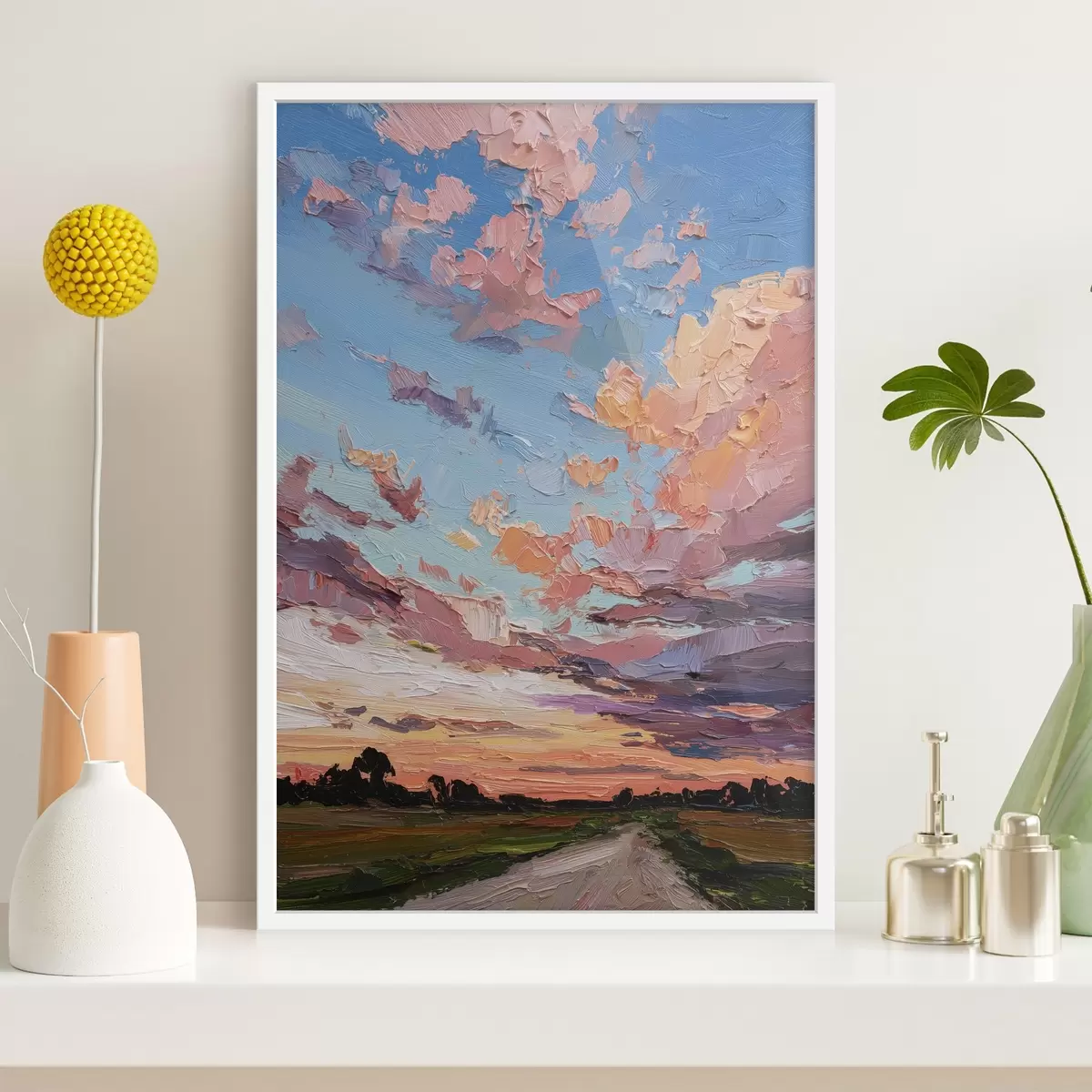 Plakatas Saulėlydžio dangus, kelias lauke, ryškūs teptuko potėpiai, aliejaus stiliaus imitacija f44795