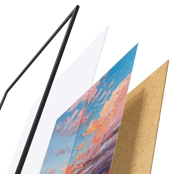Plakatą sudaro rėmas, pleksiklas, atspausdintas vaizdas ir medžio drožlių plokštės pagrindas. Plakatą galima iš karto pakabinti ant sienos dėl kitoje pusėje esančių laikiklių.