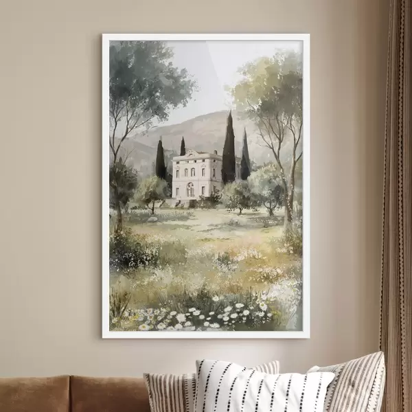 Plakatas Viduržemio jūros kaimas su baltu namu sodo apsuptyje f44796