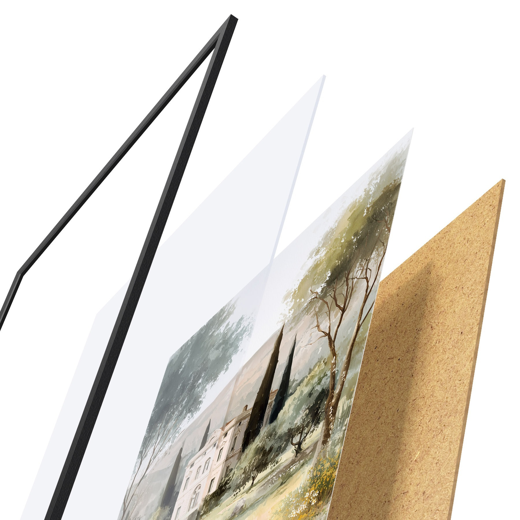 Plakatą sudaro rėmas, pleksiklas, atspausdintas vaizdas ir medžio drožlių plokštės pagrindas. Plakatą galima iš karto pakabinti ant sienos dėl kitoje pusėje esančių laikiklių.