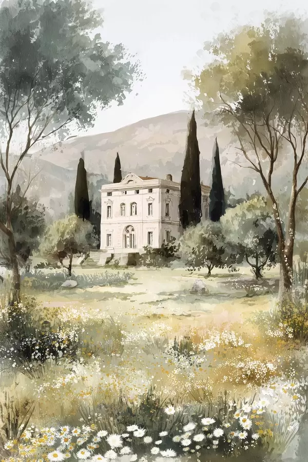 Plakatas Viduržemio jūros kaimas su baltu namu sodo apsuptyje f44796