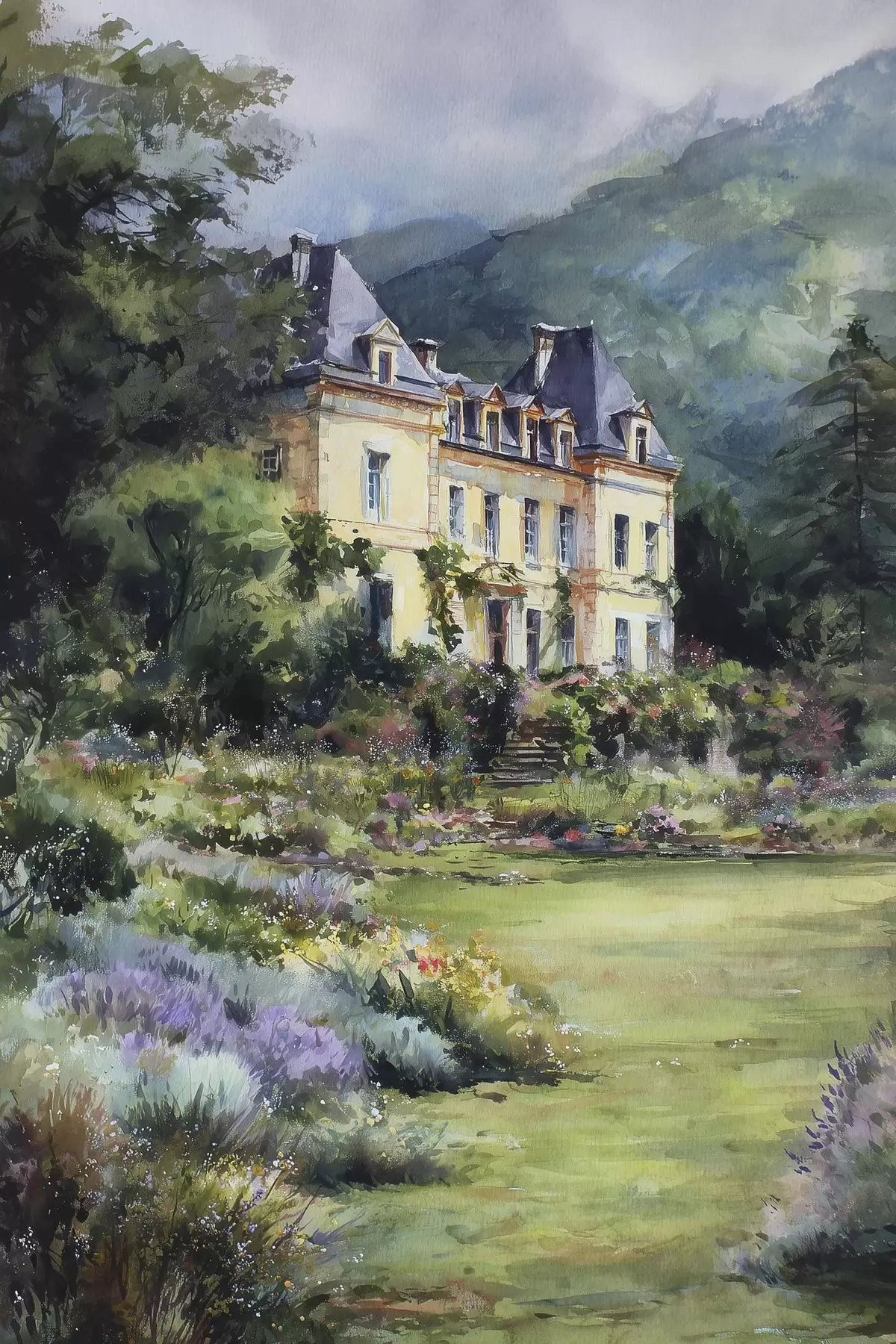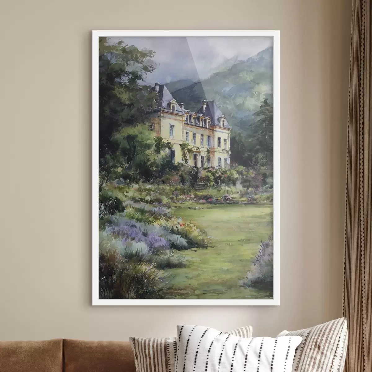 Plakatas Prancūzijos pilis, apsupta sodo su levandomis f44797