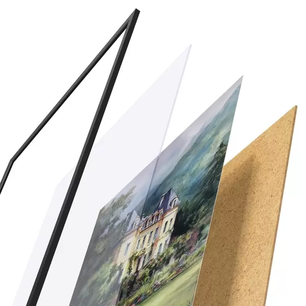 Plakatą sudaro rėmas, pleksiklas, atspausdintas vaizdas ir medžio drožlių plokštės pagrindas. Plakatą galima iš karto pakabinti ant sienos dėl kitoje pusėje esančių laikiklių.