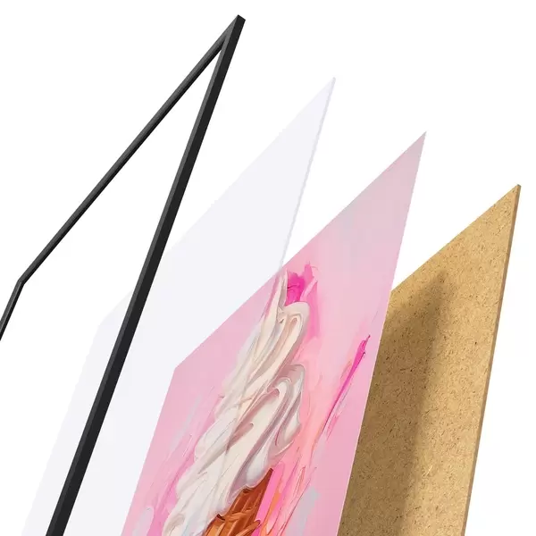 Plakatą sudaro rėmas, pleksiklas, atspausdintas vaizdas ir medžio drožlių plokštės pagrindas. Plakatą galima iš karto pakabinti ant sienos dėl kitoje pusėje esančių laikiklių.
