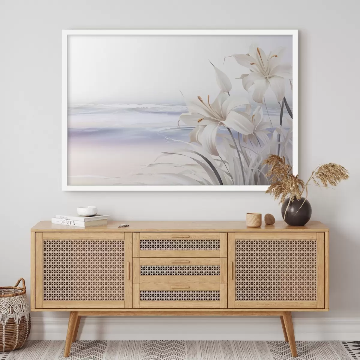 Plakatas Baltos lelijos su oranžiniais piesteliais ir ilgais lapais paplūdimyje su švelniomis bangomis fone, pastelinės spalvos Ne f44850