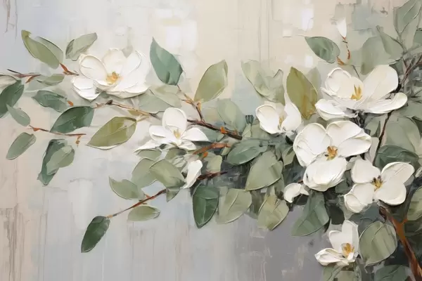 Plakatas Magnolijos gėlės su žaliais lapais ant šakos, impasto tekstūros stilius, švelni spalvų paletė f44853