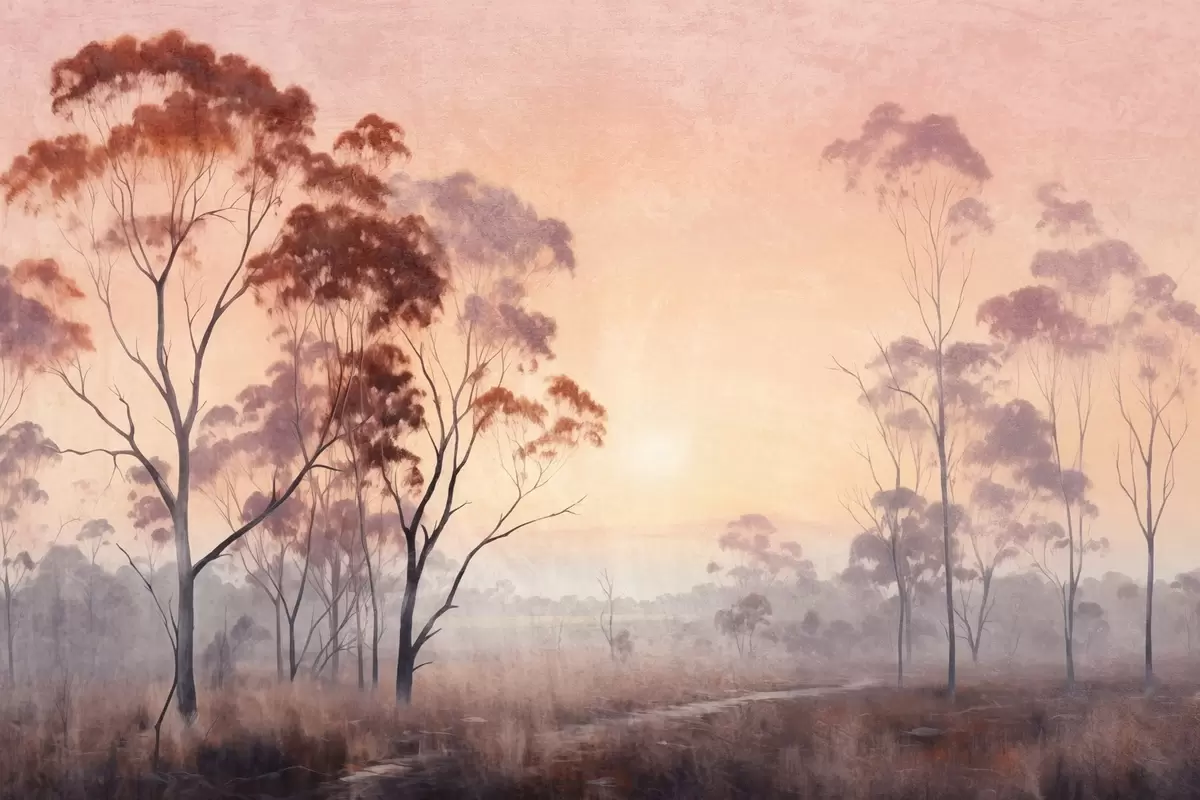 Plakatas Lauko su aukšta žole ir medžiais peizažas, fone šviečia saulė Ne f44854