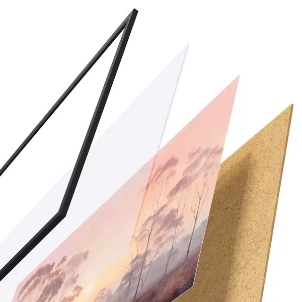 Plakatą sudaro rėmas, pleksiklas, atspausdintas vaizdas ir medžio drožlių plokštės pagrindas. Plakatą galima iš karto pakabinti ant sienos dėl kitoje pusėje esančių laikiklių.