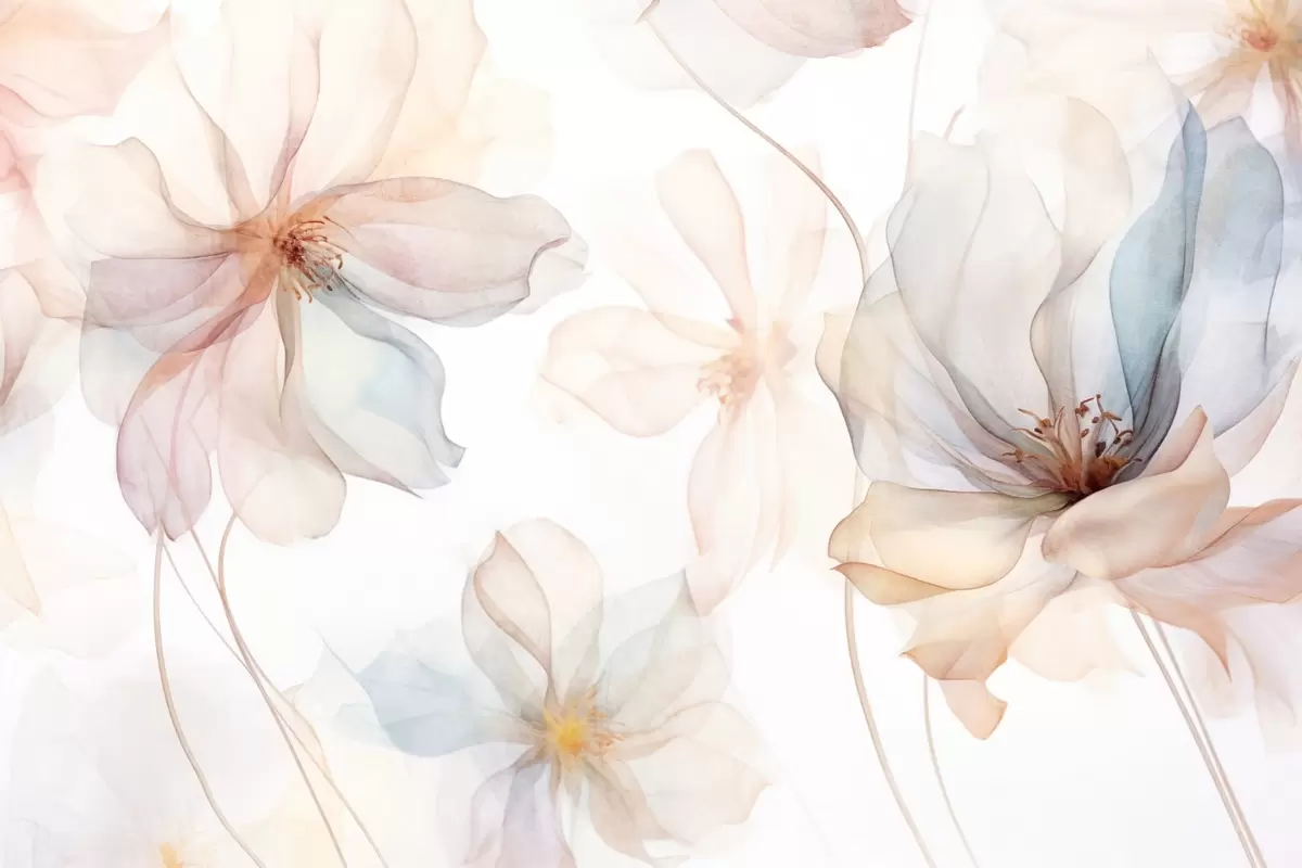 Plakatas Permatomos tekstūruotos pastelinių spalvų gėlės, subtilūs žiedlapiai, subtilios linijos baltame fone f44855