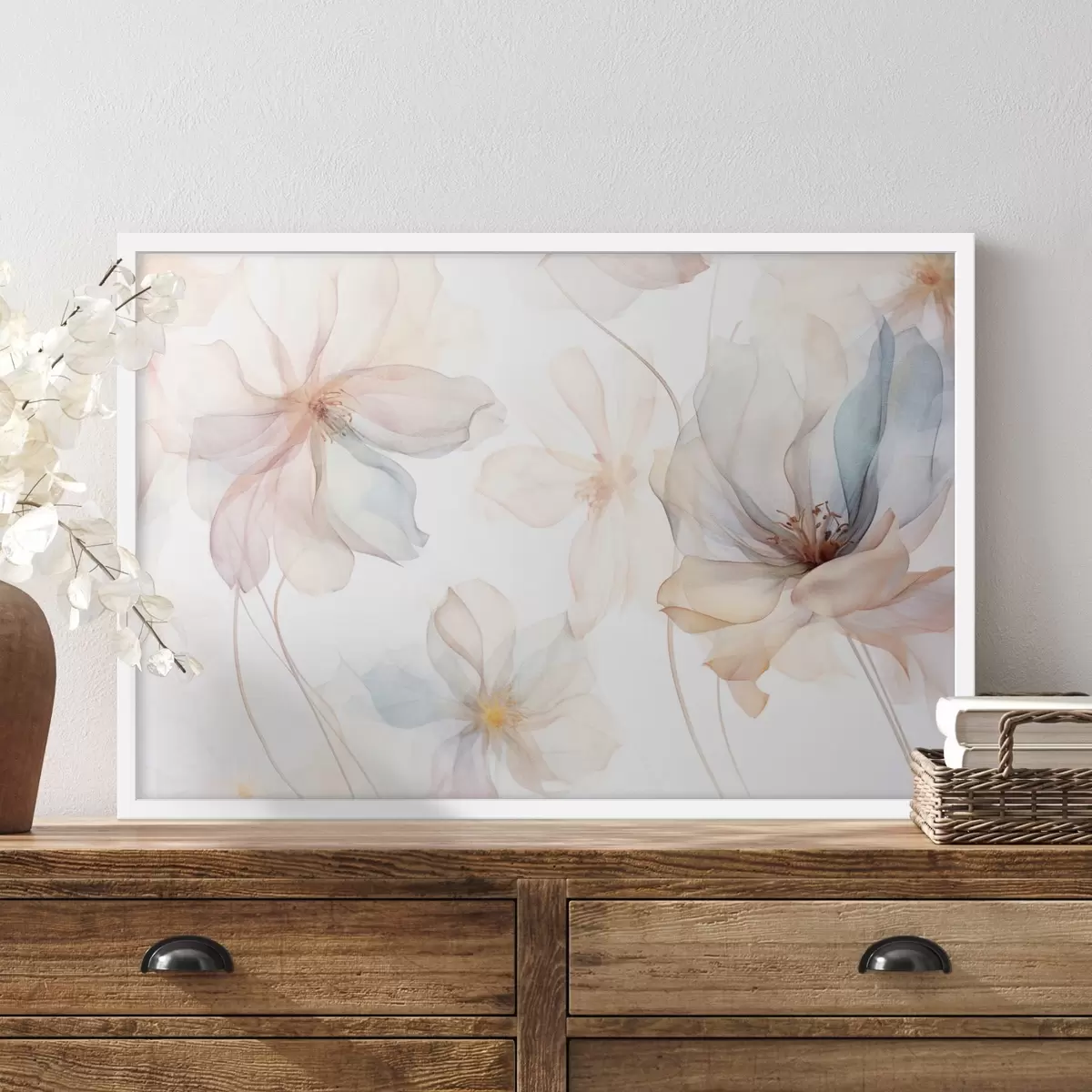 Plakatas Permatomos tekstūruotos pastelinių spalvų gėlės, subtilūs žiedlapiai, subtilios linijos baltame fone Ne f44855