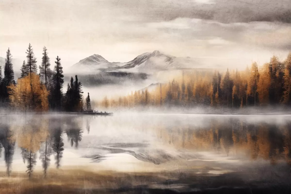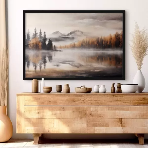 Plakatas Miglotas ežero kraštovaizdis su pušimis ir kalnais, debesuotas pilkas dangus Ne f44856