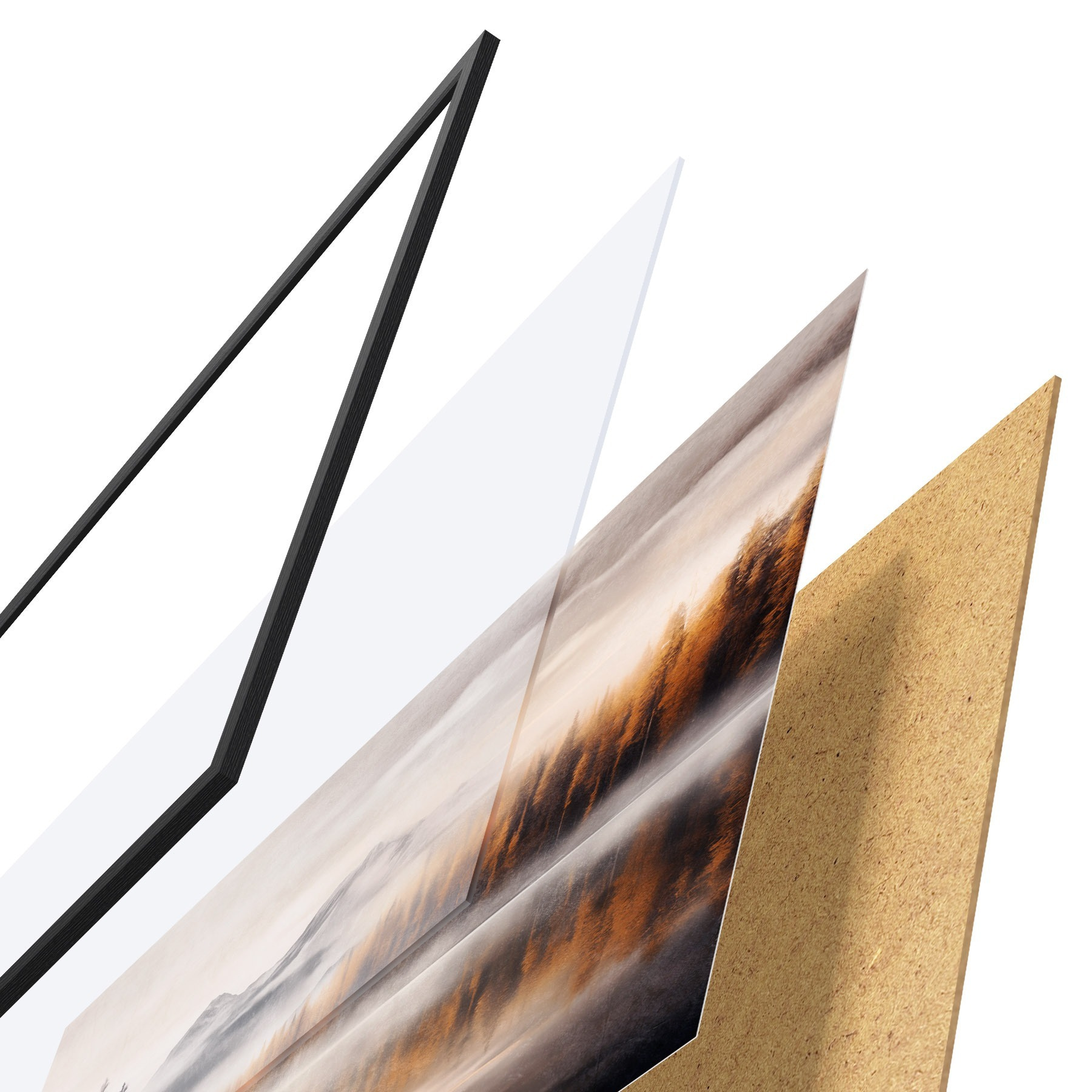 Plakatą sudaro rėmas, pleksiklas, atspausdintas vaizdas ir medžio drožlių plokštės pagrindas. Plakatą galima iš karto pakabinti ant sienos dėl kitoje pusėje esančių laikiklių.