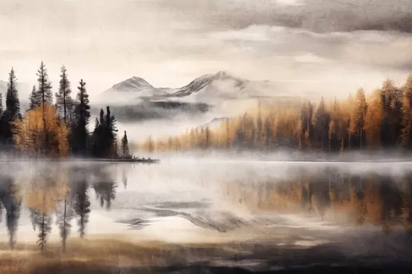 Plakatas Miglotas ežero kraštovaizdis su pušimis ir kalnais, debesuotas pilkas dangus Ne f44856