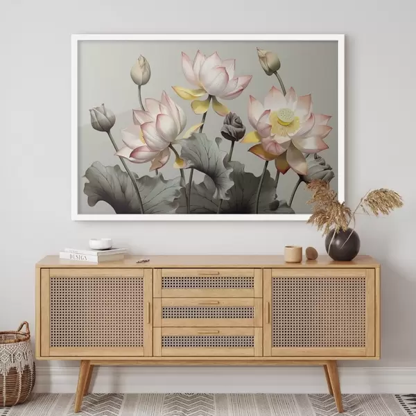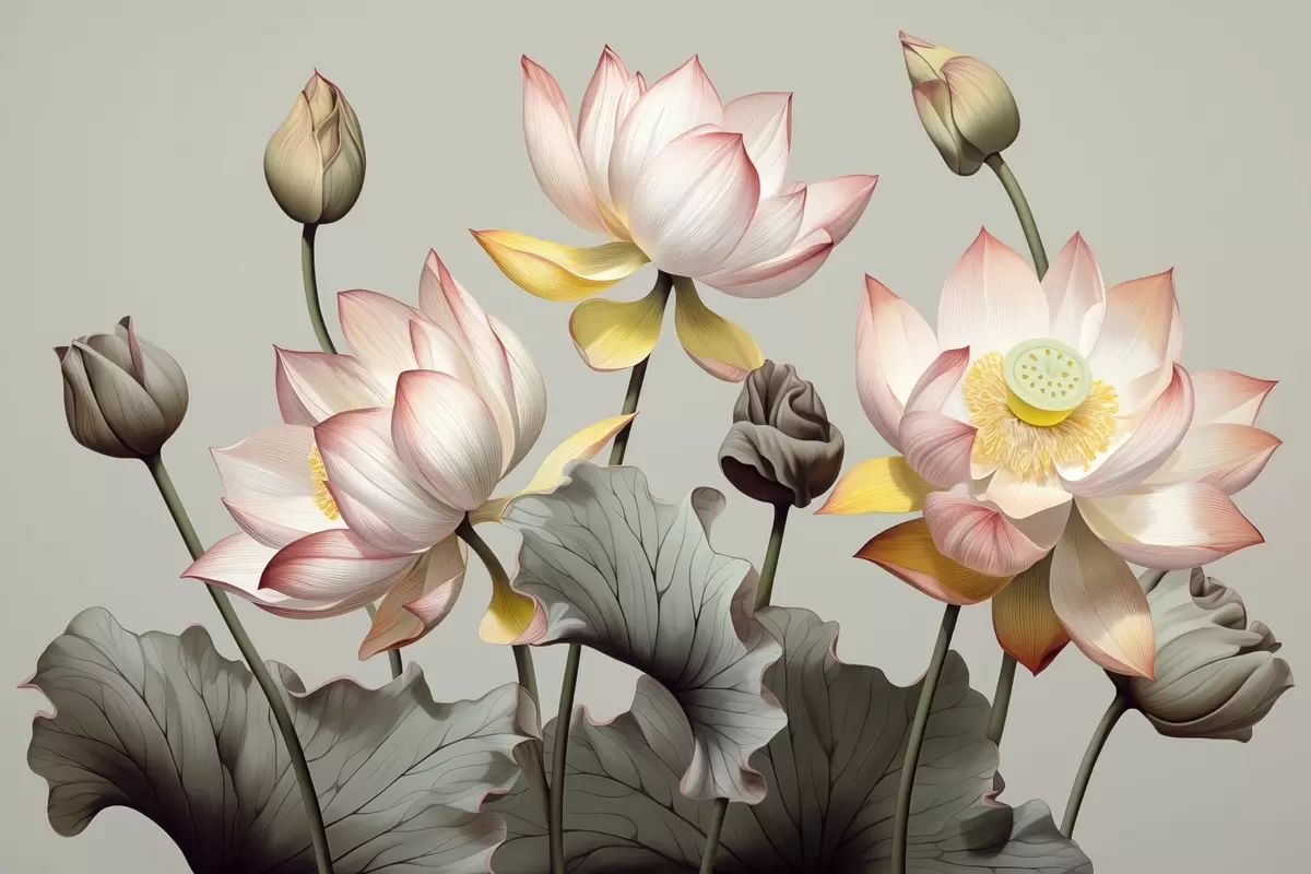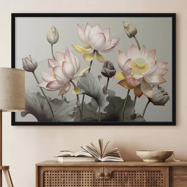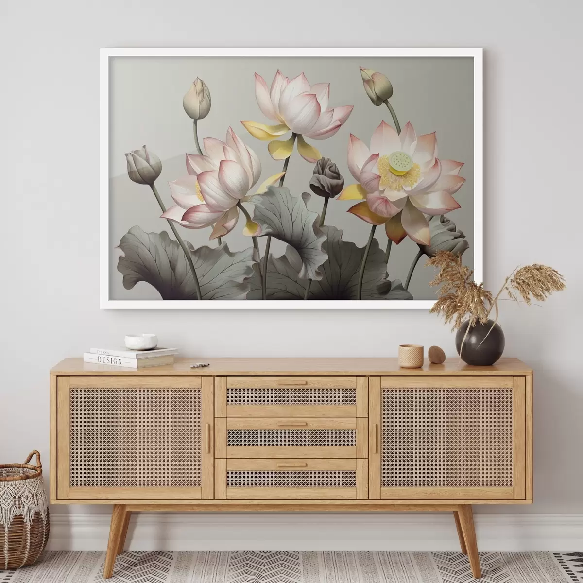 Plakatas Lotoso gėlės su pasteliniais žiedlapiais ir žaliais lapais, prislopintų spalvų paletė, vienspalviame fone f44862