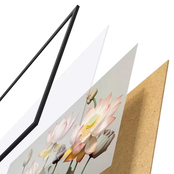 Plakatą sudaro rėmas, pleksiklas, atspausdintas vaizdas ir medžio drožlių plokštės pagrindas. Plakatą galima iš karto pakabinti ant sienos dėl kitoje pusėje esančių laikiklių.