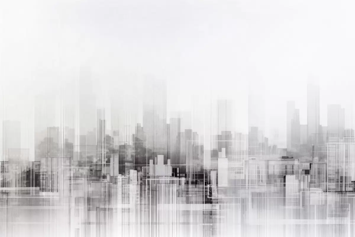 Plakatas Tekstūrinis minimalistinis miesto peizažas su aukštais pastatais ir dangoraižiais, kurių siluetai išryškėja balto dangaus fone Ne f44863
