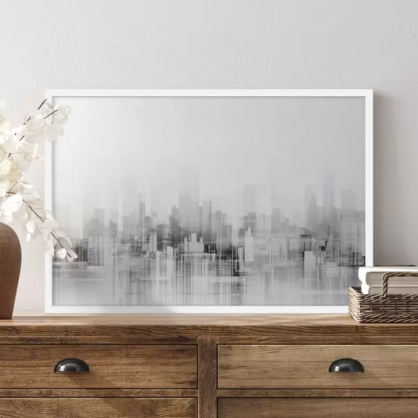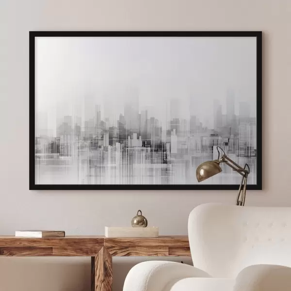 Plakatas Tekstūrinis minimalistinis miesto peizažas su aukštais pastatais ir dangoraižiais, kurių siluetai išryškėja balto dangaus fone f44863