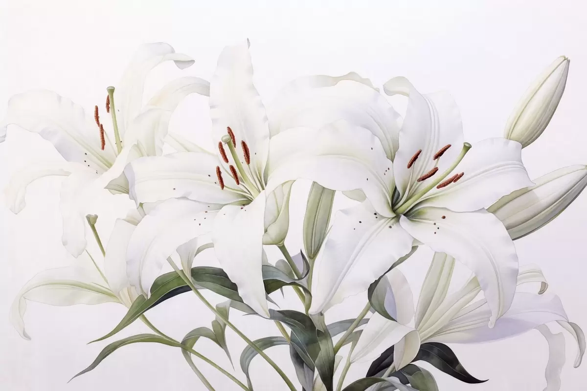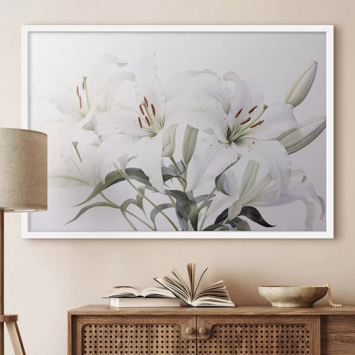 Plakatas Baltų lelijų puokštė su žaliais lapeliais, švelniais žiedlapiais ir švelniu baltu fonu f44868