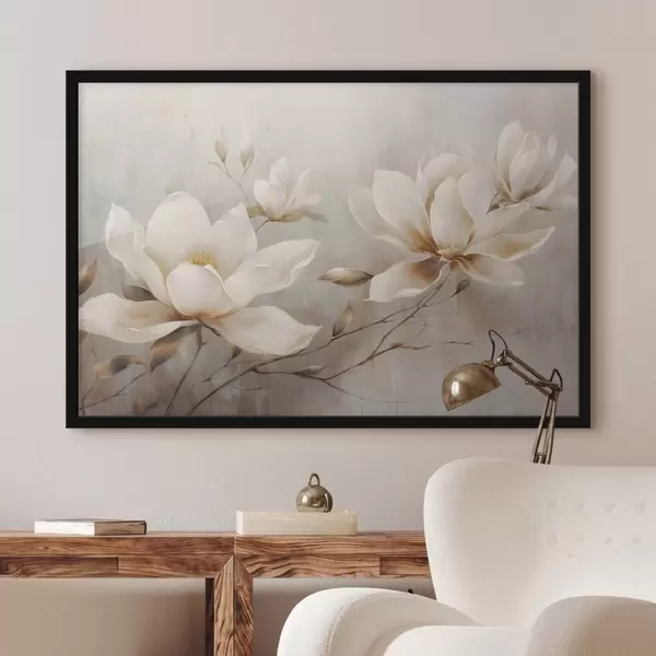 Plakatas Tekstūruotos senovinės baltos magnolijos gėlės ant šakų šviesiai rudame fone f44869