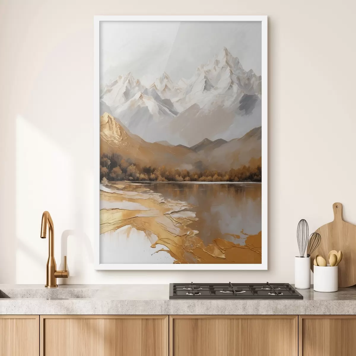 Plakatas Kalnų kraštovaizdis su šiltų spalvų ežeru f44877
