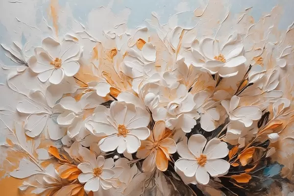 Plakatas Baltos ir persikinės gėlės mėlyname fone su pastelinėmis spalvomis f44879