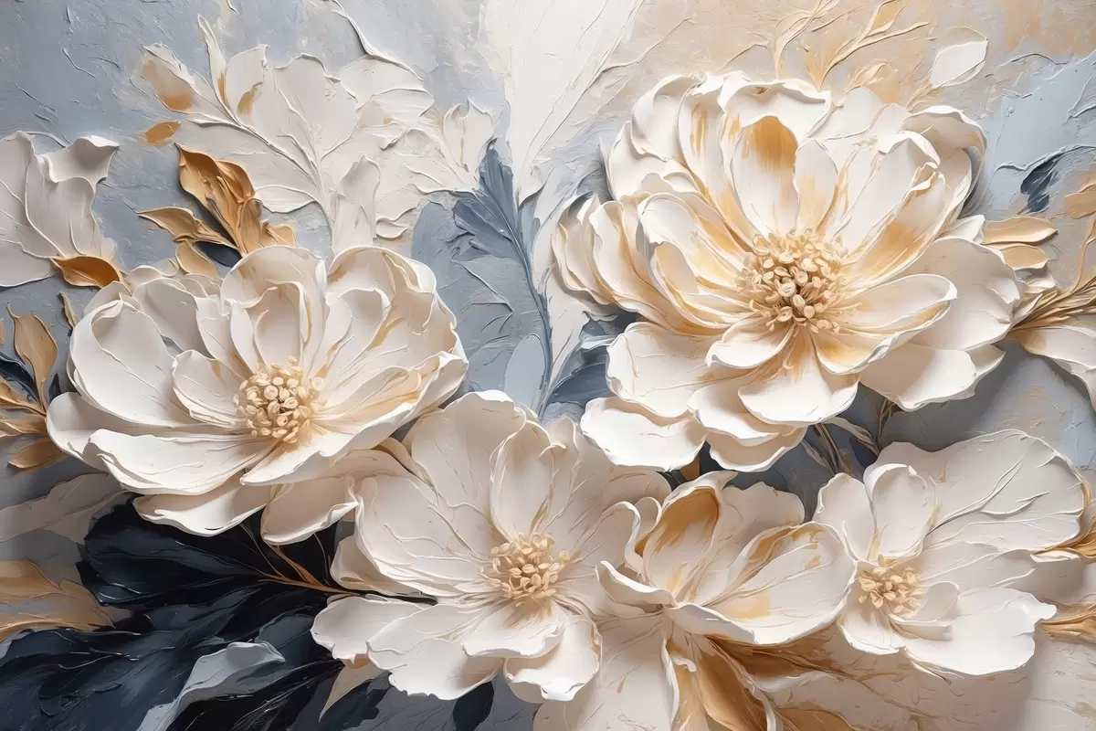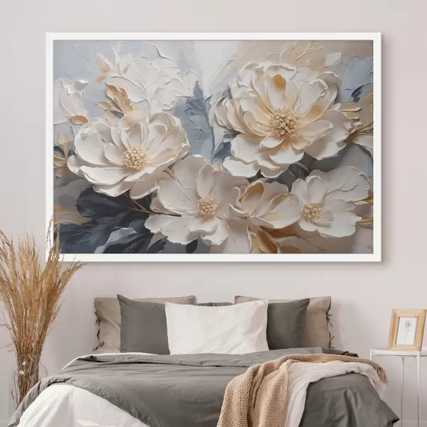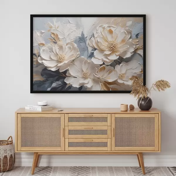Plakatas Tūriniai kreminiai bijūnai šviesiai mėlyname fone f44880