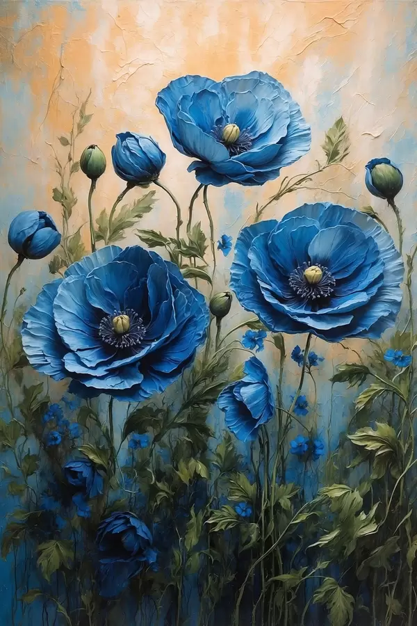 Plakatas Mėlynos aguonos pasteliniame fone su lapais Ne f44882