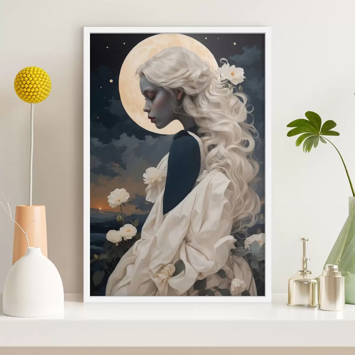 Plakatas Mergaitės portretas su baltais plaukais ir mėnulio pilnatimi Ne f44887