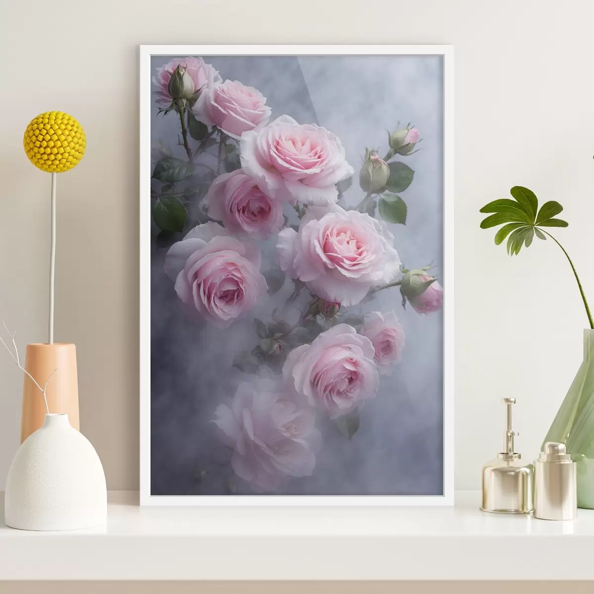 Plakatas Švelniai rausvos rožės rūke su žaliais lapais Ne f44892