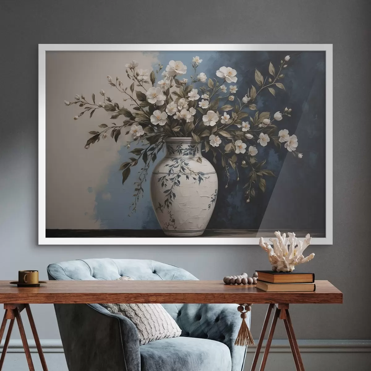 Plakatas Baltos ir geltonos gėlės didelėje vazoje mėlyname fone f44893