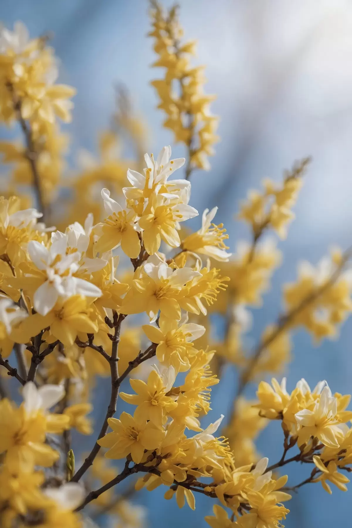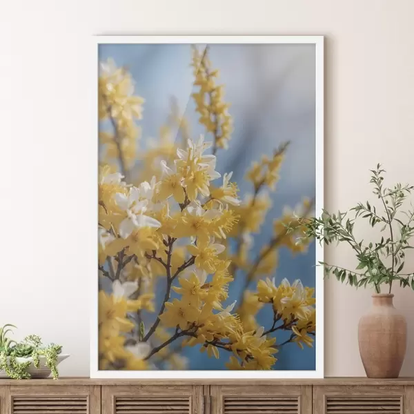 Plakatas Geltonos gėlės mėlyname fone su švelniu fokusavimu f44894