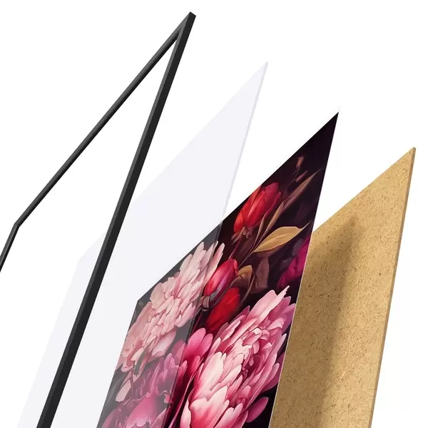 Plakatą sudaro rėmas, pleksiklas, atspausdintas vaizdas ir medžio drožlių plokštės pagrindas. Plakatą galima iš karto pakabinti ant sienos dėl kitoje pusėje esančių laikiklių.