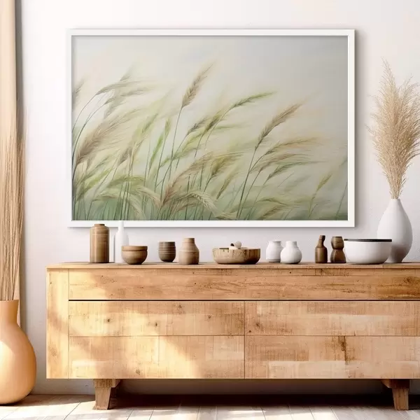 Plakatas Kviečių laukas su geltonomis ir žaliomis javų varpomis, švelnūs teptuko potėpiai ir šviesi spalvų paletė, natūrali atmosfera f44923