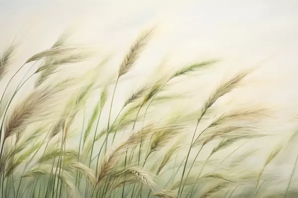 Plakatas Kviečių laukas su geltonomis ir žaliomis javų varpomis, švelnūs teptuko potėpiai ir šviesi spalvų paletė, natūrali atmosfera f44923