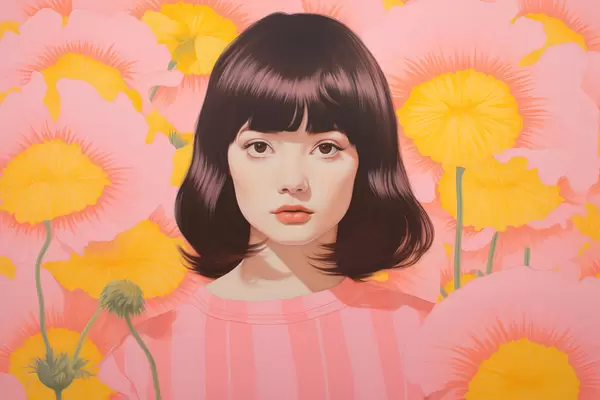 Plakatas Dekoratyvus minimalistinis azijietės mergaitės portretas geltonų ir rausvų gėlių lauke Ne f44924