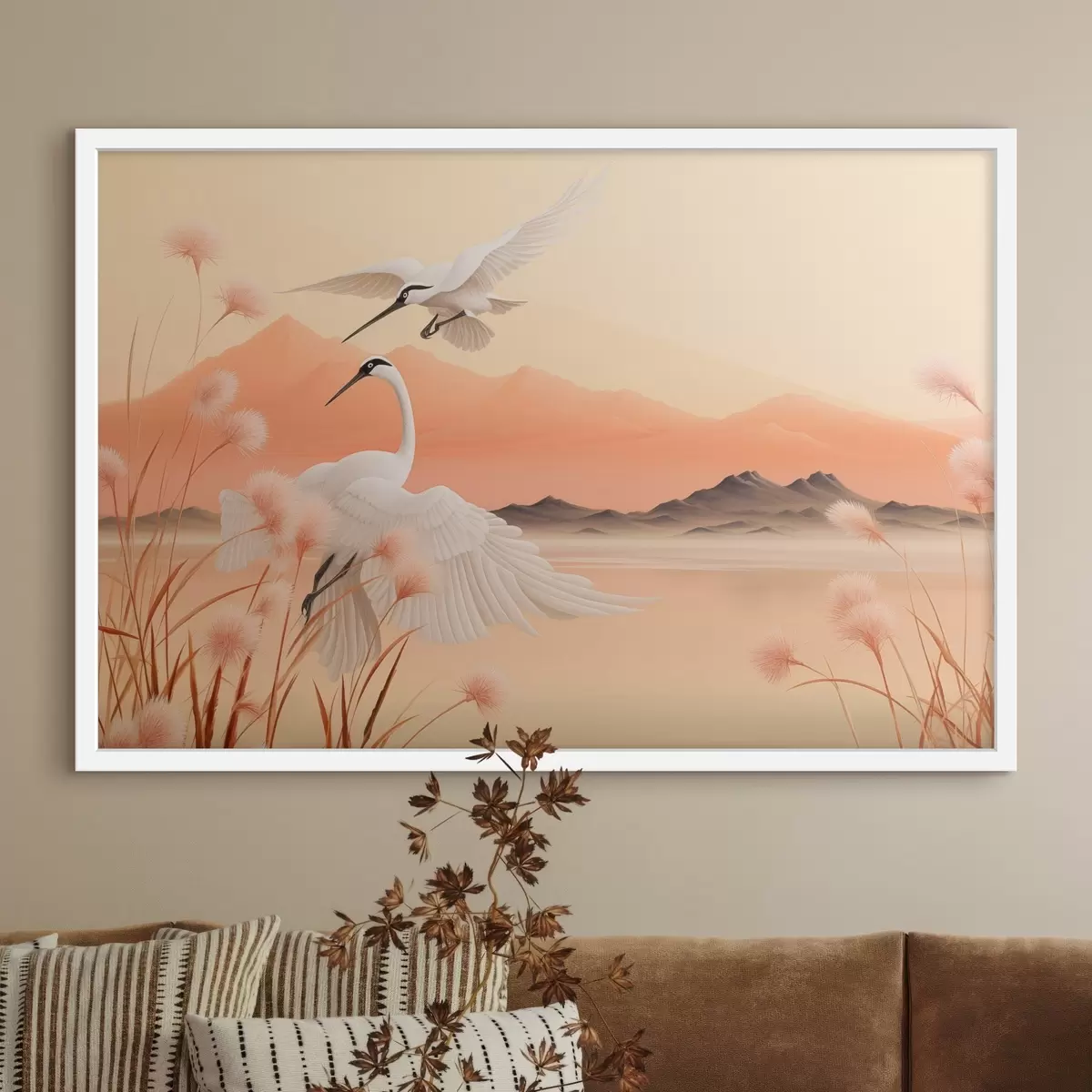 Plakatas Baltos gervės su rausvomis nendrėmis pirmame plane, kalnai ir ežeras antrame plane, minkšta oranžinė šviesa Ne f44925