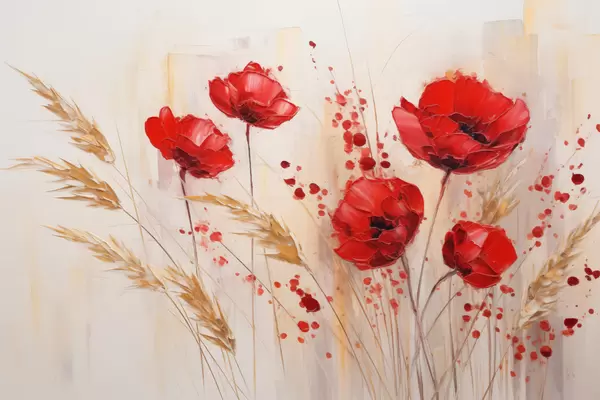 Plakatas Raudonų aguonų žiedai su geltonais kviečių stiebais švelniame neutraliame fone su raudonų dažų purslais f44926