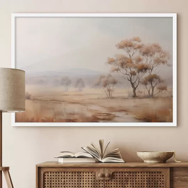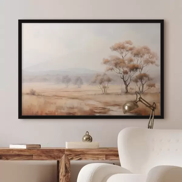 Plakatas Laukas su oranžine žole ir keliais medžiais su oranžiniais lapais, fone - kalnai su debesuotu dangumi Ne f44927