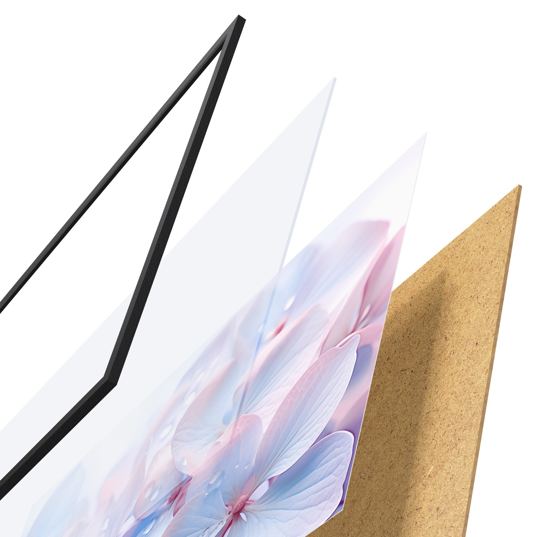 Plakatas Hortenzijos gėlės su vandens lašeliais ant subtilių žiedlapių, švelnios pastelinės spalvos, šviesiai mėlyni ir rožiniai atspalviai f44929