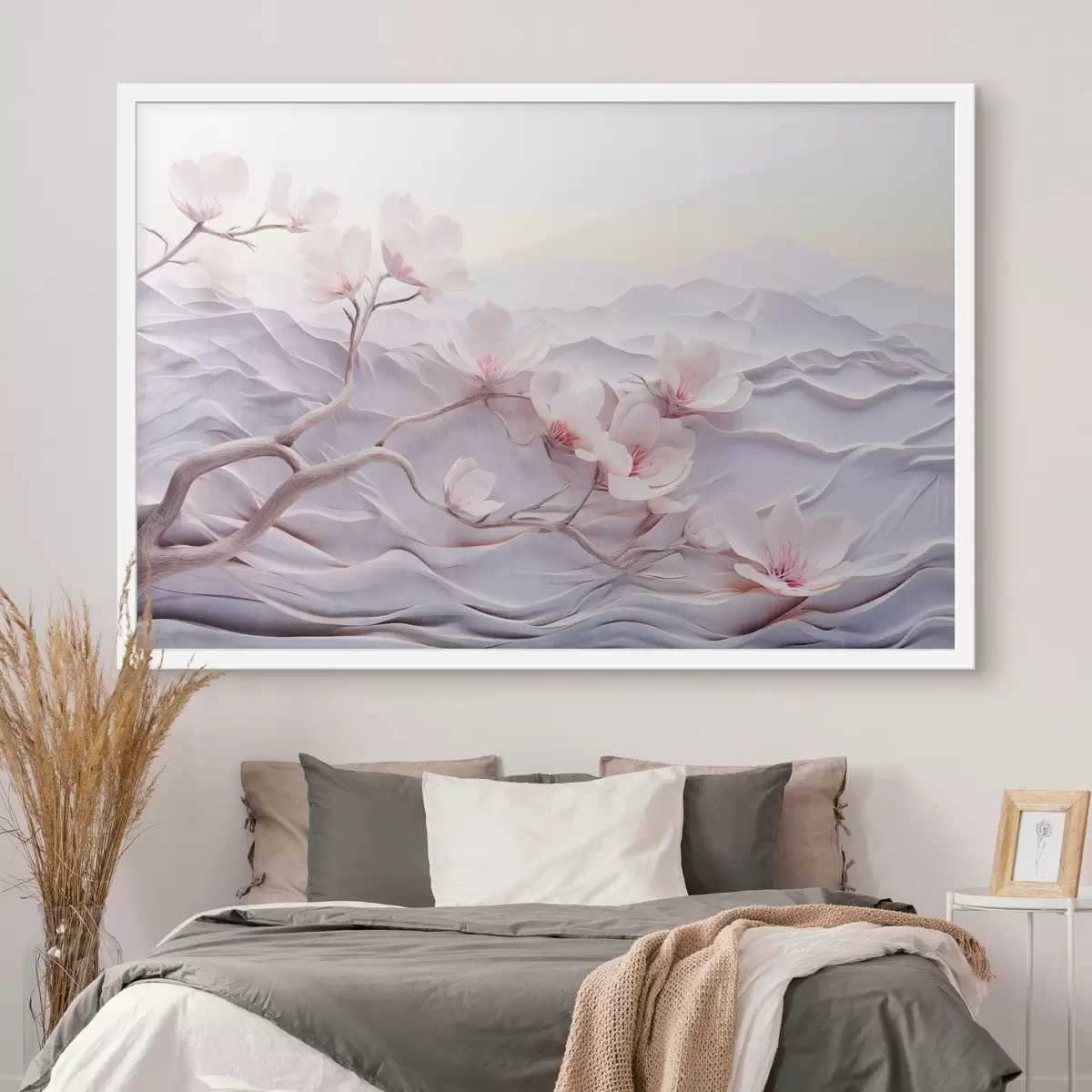 Plakatas Žiedų šaka su rausvais žiedais, kalnai fone, švelnios pastelinės spalvos, japonų tekstūrinis menas f44930