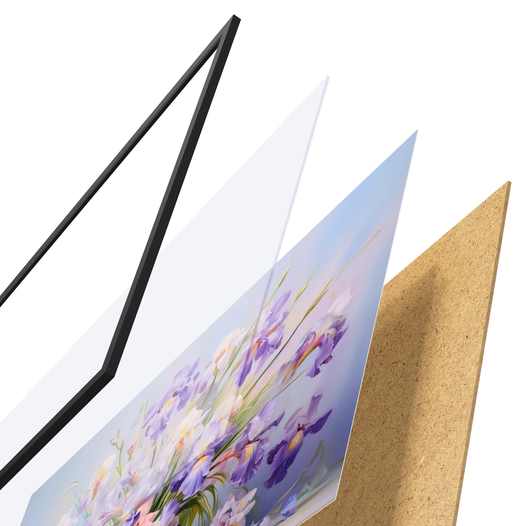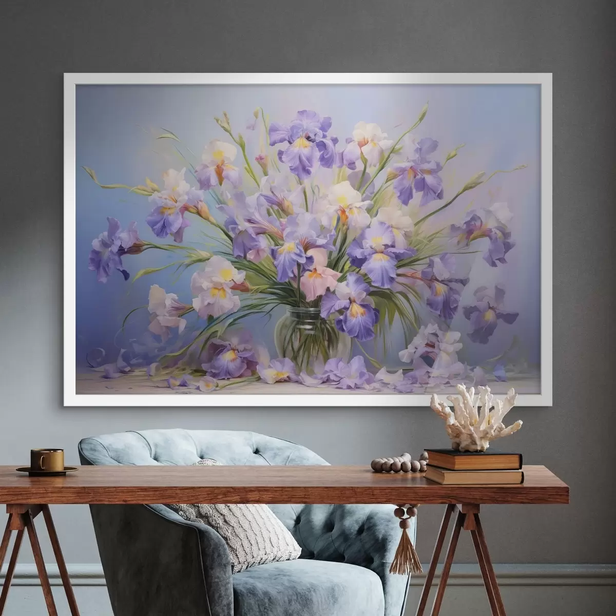 Plakatas Vaza su daugybe pastelinių irisų, keli žiedlapiai išbarstyti ant stalo, švelnus pastelinis mėlynos ir rožinės spalvos fonas f44933