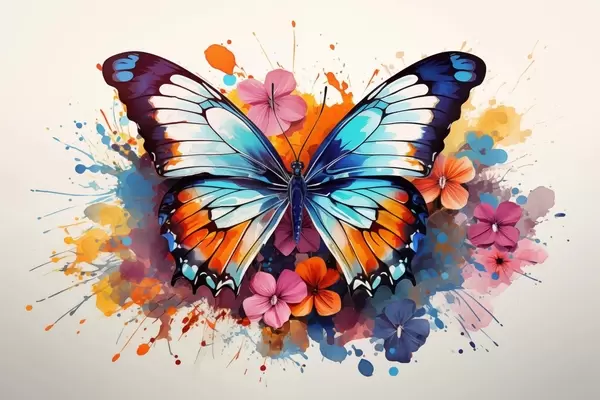 Plakatas Dinamiška drugelio ir gėlių dėmių kompozicija meno stiliumi f44943