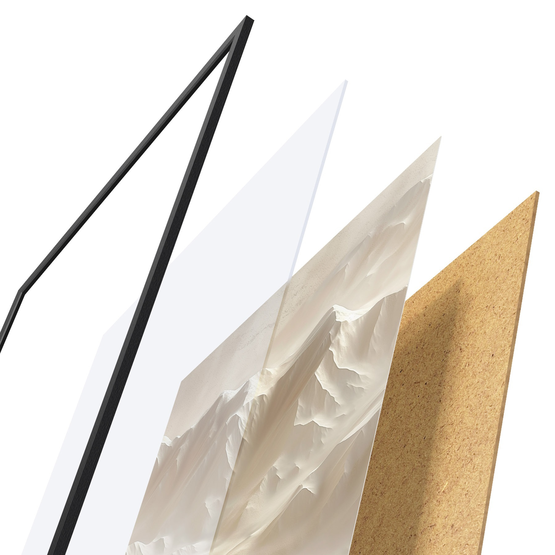 Plakatą sudaro rėmas, pleksiklas, atspausdintas vaizdas ir medžio drožlių plokštės pagrindas. Plakatą galima iš karto pakabinti ant sienos dėl kitoje pusėje esančių laikiklių.