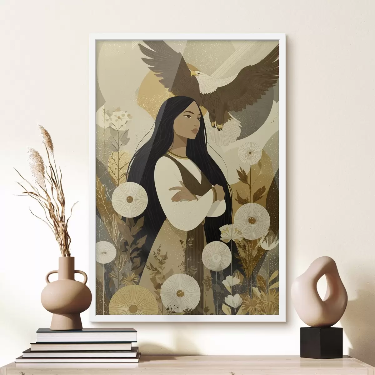 Plakatas Moteris su skrendančiu ereliu, gentinis stilius, smėlio spalvos Ne f44977