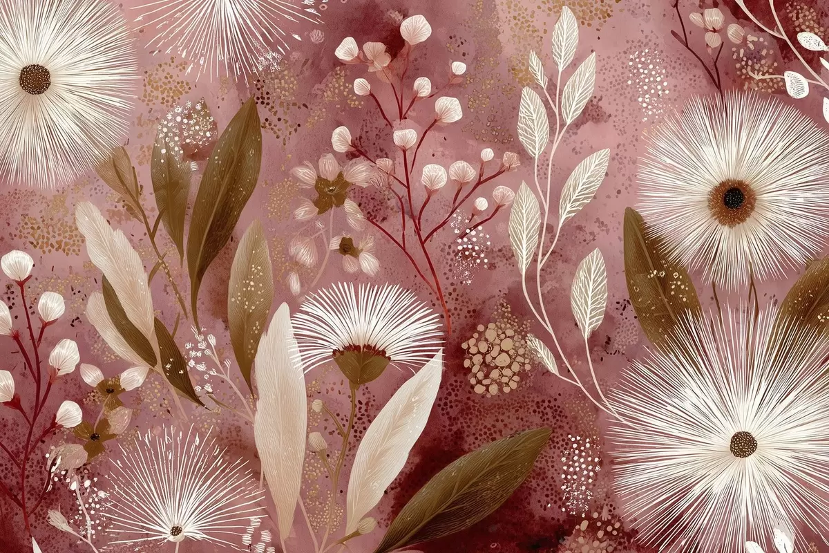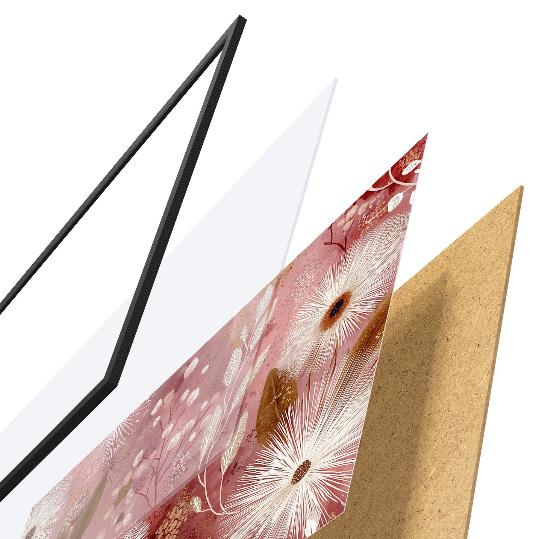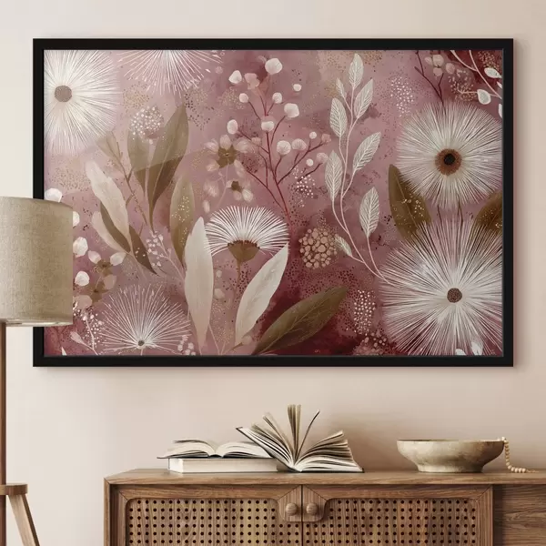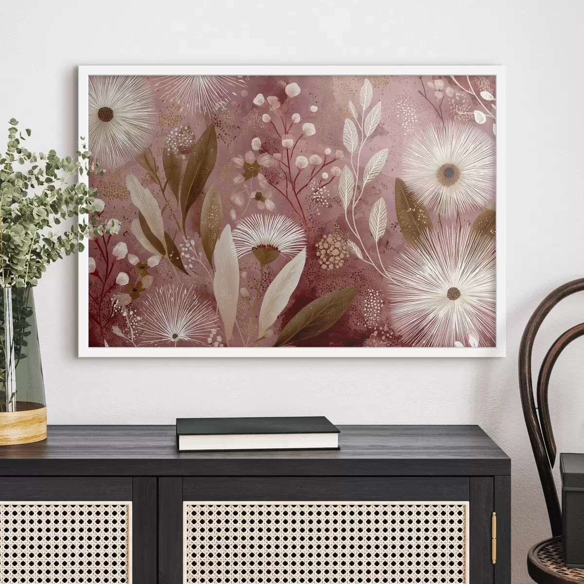 Plakatas Boho stiliaus baltos gėlės raudoname fone, detalus piešinys f44979