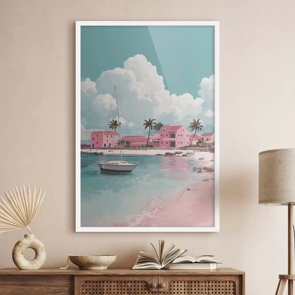 Plakatas Rožinis paplūdimys su ryškia saule, burlaiviu ir namais Ne f44986
