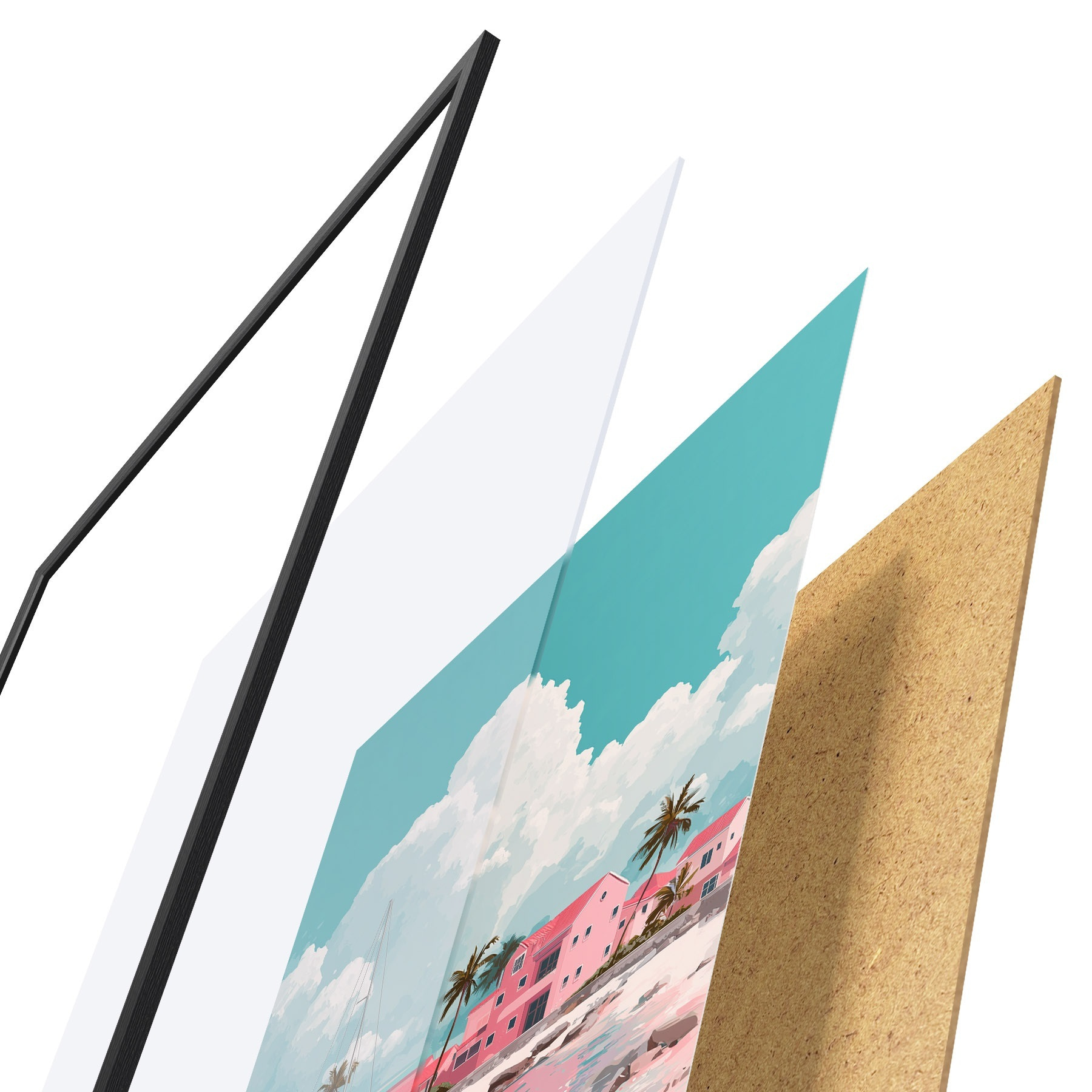 Plakatą sudaro rėmas, pleksiklas, atspausdintas vaizdas ir medžio drožlių plokštės pagrindas. Plakatą galima iš karto pakabinti ant sienos dėl kitoje pusėje esančių laikiklių.
