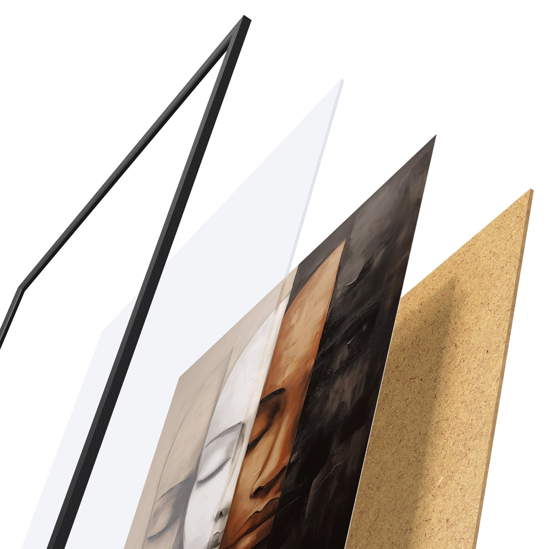 Plakatą sudaro rėmas, pleksiklas, atspausdintas vaizdas ir medžio drožlių plokštės pagrindas. Plakatą galima iš karto pakabinti ant sienos dėl kitoje pusėje esančių laikiklių.