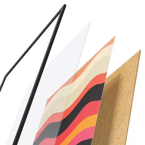 Plakatą sudaro rėmas, pleksiklas, atspausdintas vaizdas ir medžio drožlių plokštės pagrindas. Plakatą galima iš karto pakabinti ant sienos dėl kitoje pusėje esančių laikiklių.